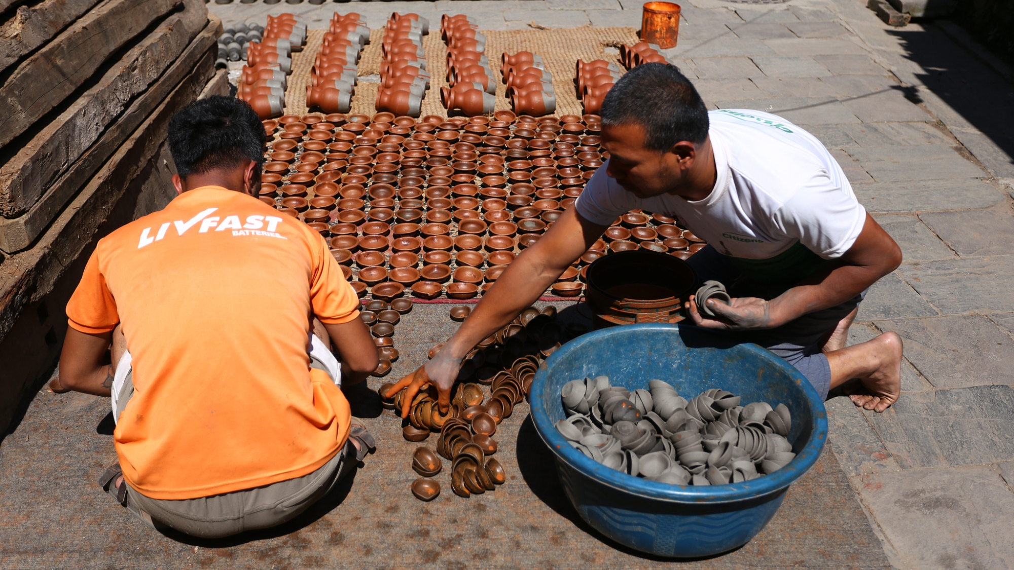 नेपाल के तिहाड़ त्योहार से पहले नेपाल के भक्तपुर में पॉटरी स्क्वायर पर मज़दूर मिट्टी के बर्तन तैयार करते हैं। काठमांडू घाटी का एक प्राचीन शहर के रूप में भक्तपुर अपनी समृद्ध संस्कृति, मंदिरों और लकड़ी, धातु और पत्थर की नक्काशी के लिए यूनेस्को विश्व धरोहर स्थल है।