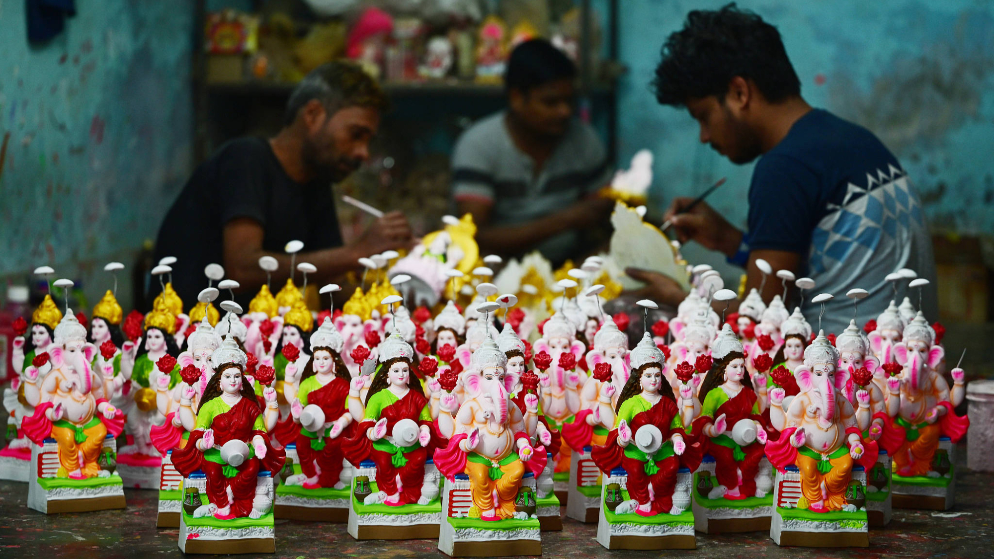 दिवाली से पहले भारत के लखनऊ में कारीगर पुराने शहर में अपनी कार्यशालाओं में भगवान गणेश और देवी लक्ष्मी की मूर्तियाँ बनाने में व्यस्त हैं।