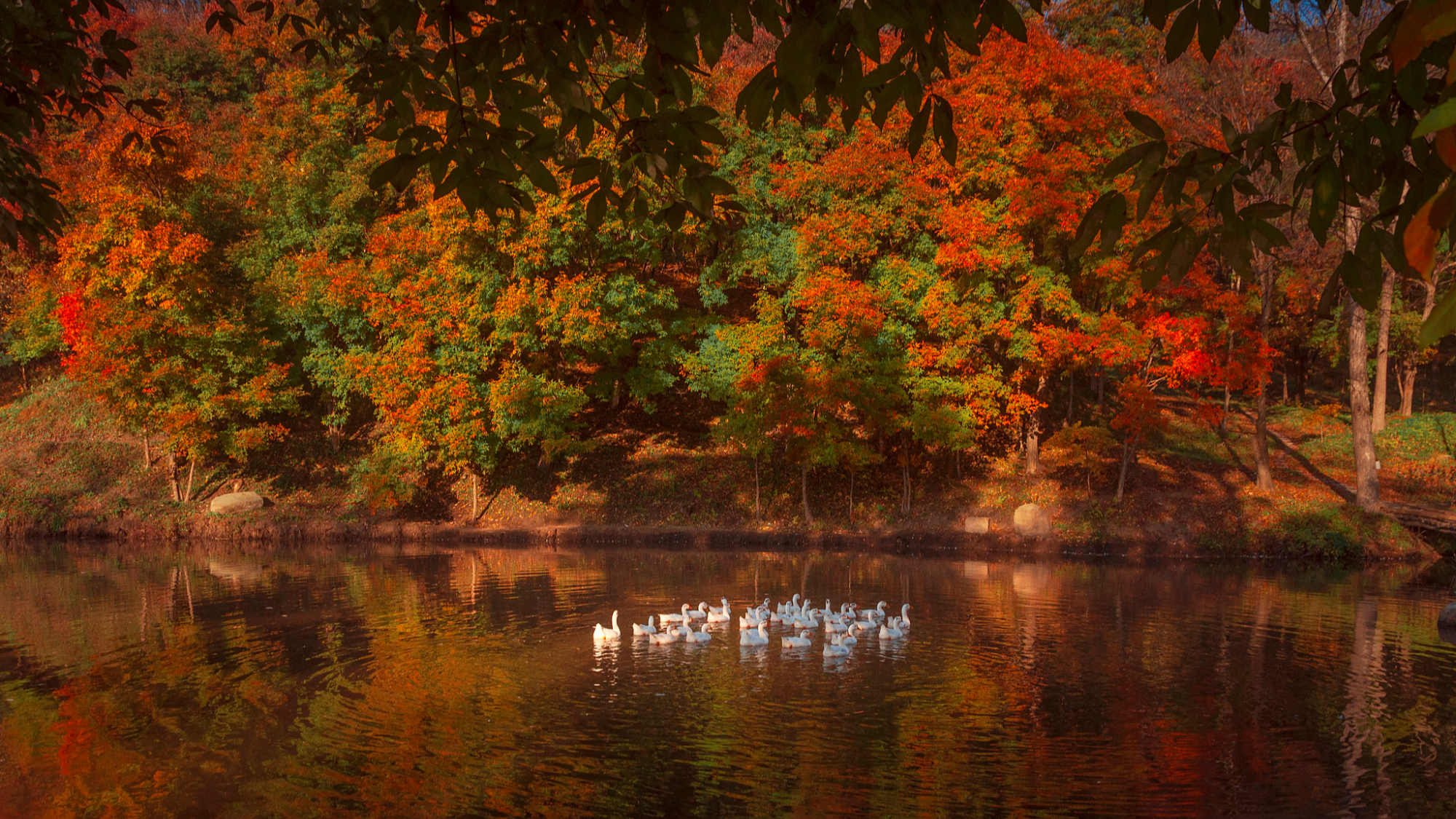 शरद ऋतु के लाल मेपल के पत्ते आग की तरह दिखते हैं।
