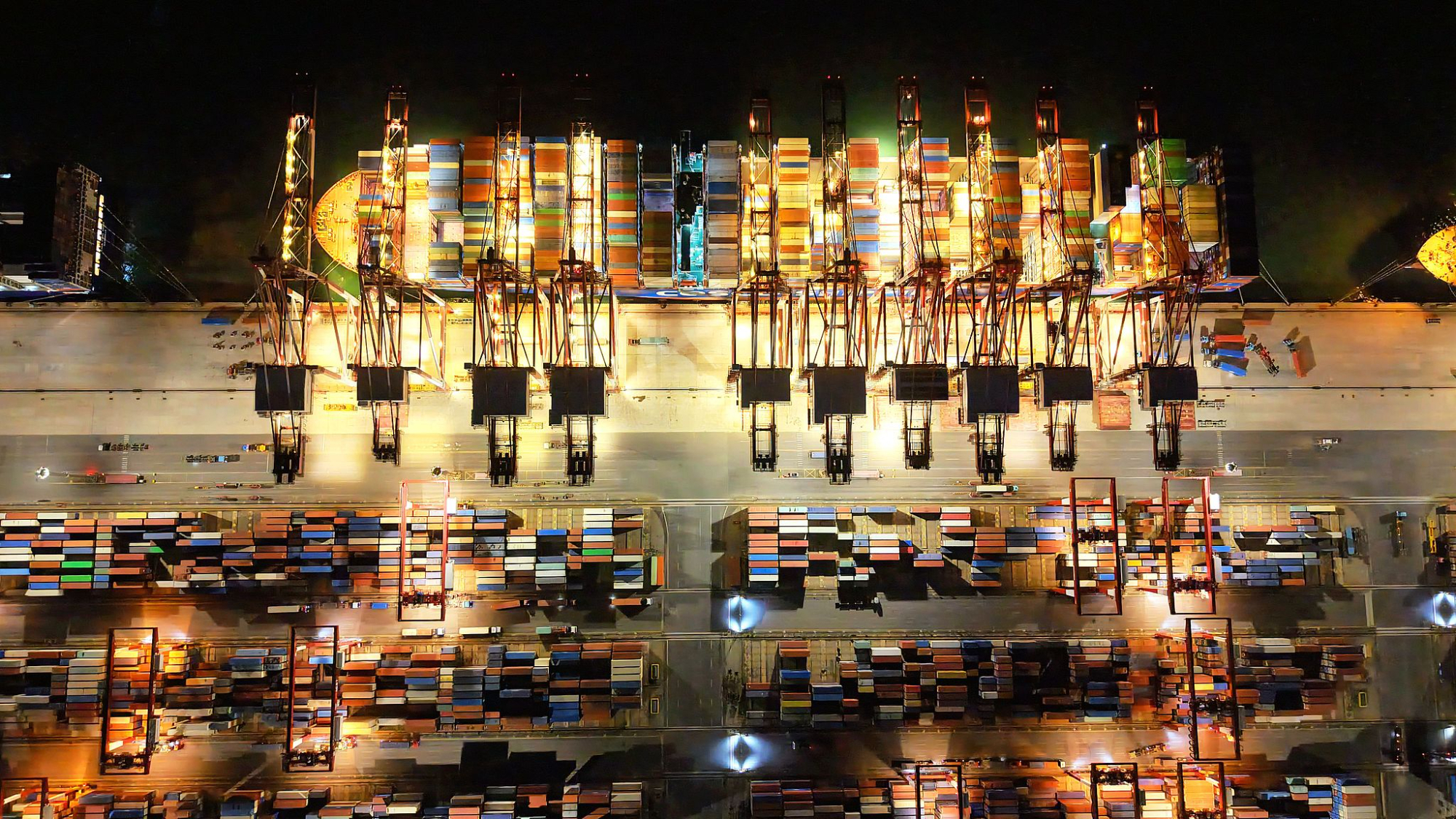 छिंगदाओ बंदरगाह रात में चमकदार रोशनी से जगमगाता है और मालवाहक यातायात से गुलजार रहता है।