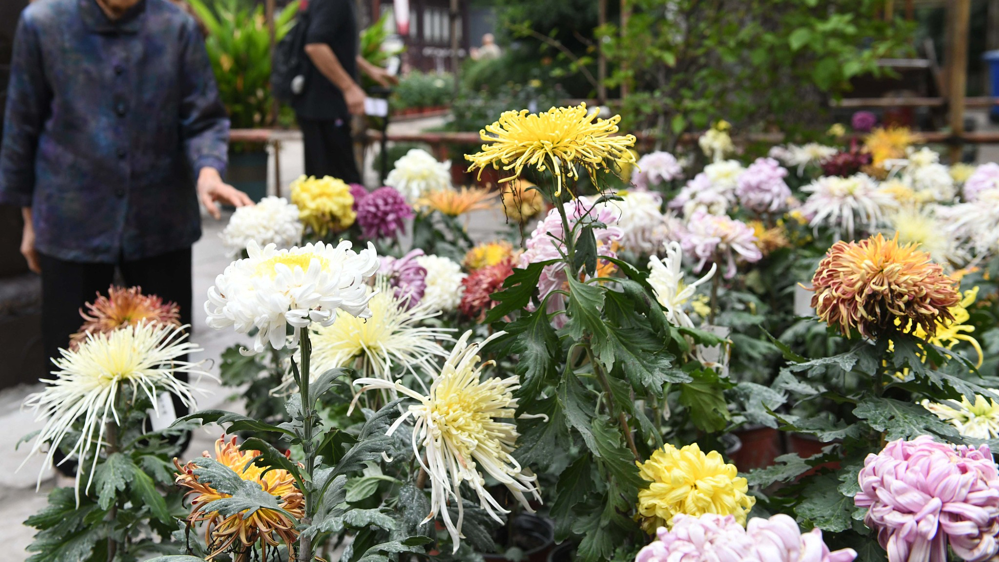 नागरिक गुलदाउदी की प्रशंसा करते हुए