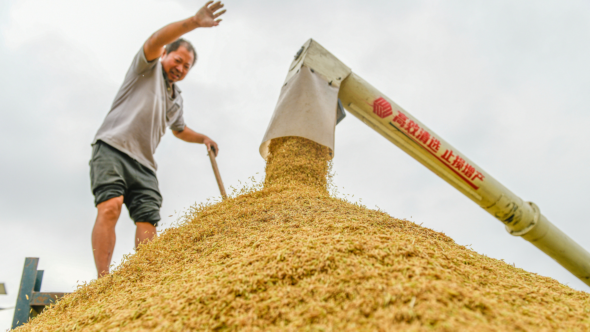 हुनान प्रांत के योंगचोउ शहर में चावल की कटाई करते किसान
