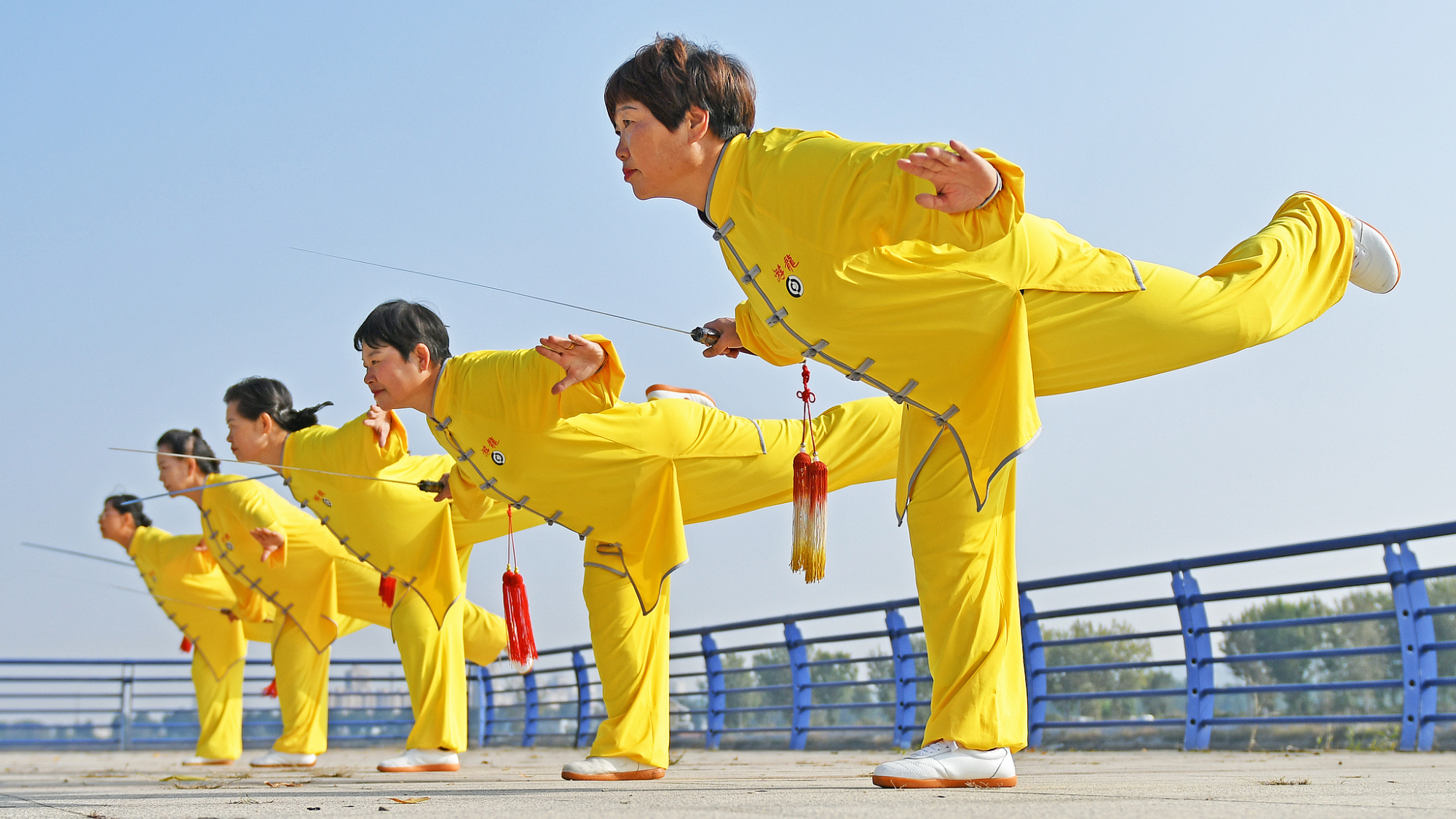 चीन के शानदोंग प्रांत के येनथाई शहर में वरिष्ठ फिटनेस प्रेमी सुबह नदी के किनारे व्यायाम करते हैं।