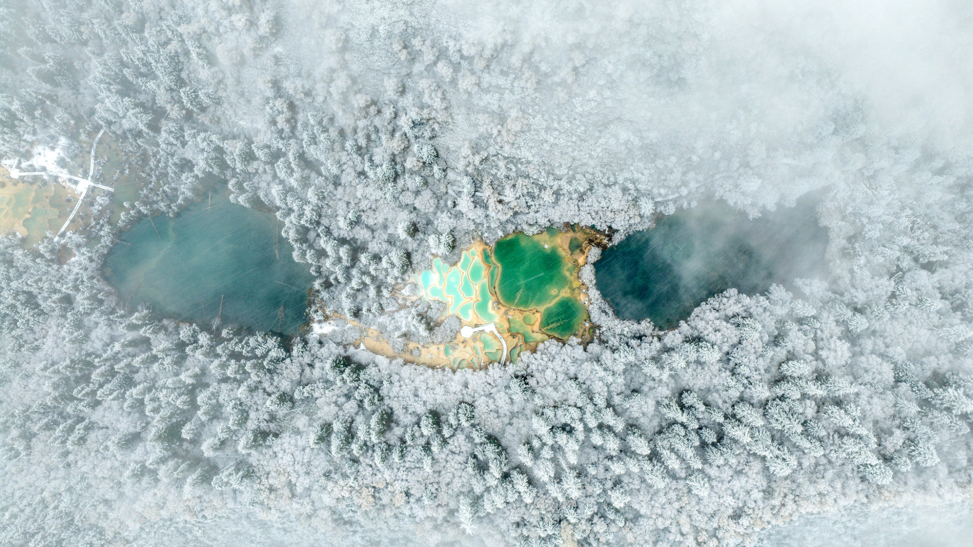 दक्षिण पश्चिम चीन के सछ्वान प्रांत के आबा तिब्बती और छ्यांग स्वायत्त प्रीफेक्चर की चिउचाइगोउ काउंटी में स्थित चिउचाइगोउ दर्शनीय क्षेत्र में शुक्रवार को इस शीत ऋतु की पहली बर्फ़बारी गिरी थी। जिससे इस क्षेत्र में 2600 से अधिक रंगबिरंगी चूना-पत्थर के पूलों को हल्के से ढक लिया, मानो कोई परीकथा सच हो गई हो। बर्फ़ की नाजुक चादर के नीचे, पूलों की तलहटी में फ़िरोज़ी और पन्ने जैसे "ड्रैगन स्केल" पैटर्न और भी चमकीले हो उठे हैं। यह एक स्वप्निल शीतकालीन अजूबा है – एकदम शुद्ध, काव्यमय और शांत।