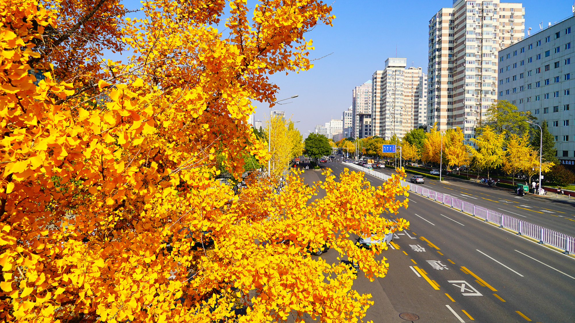 पेइचिंग की सड़कों के दोनों ओर सुनहरे जिन्कगो के पत्ते