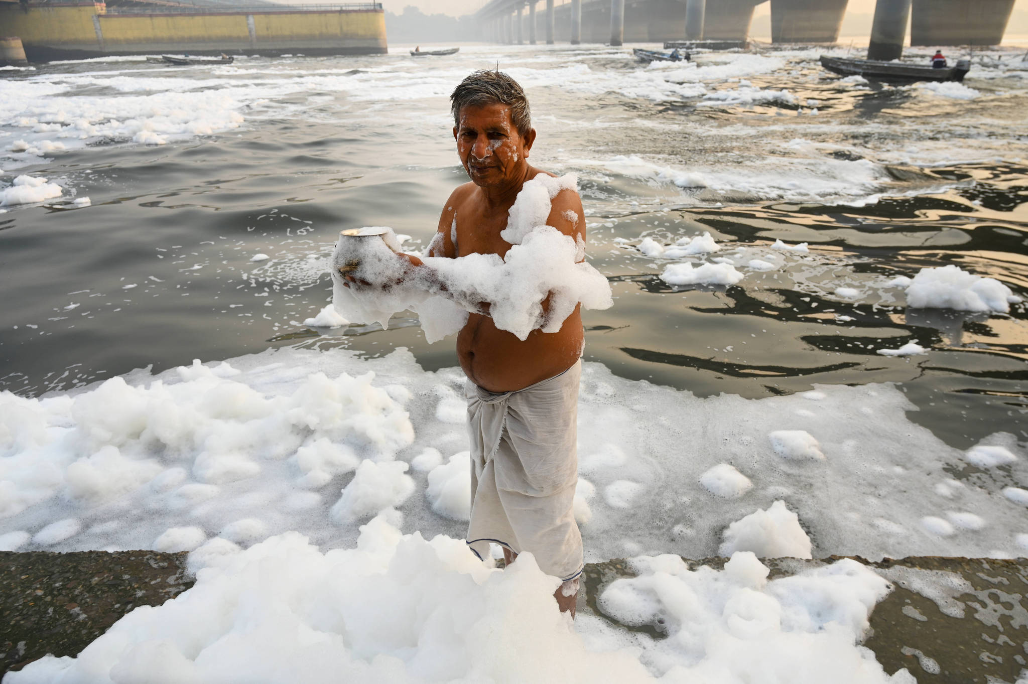 18 नवंबर को, भारत के नई दिल्ली में यमुना नदी के कालिंदीकुंजी खंड में एक व्यक्ति नहा रहा है। यमुना नदी में छोड़े जाने वाले सीवेज और औद्योगिक अपशिष्ट जल में अमोनिया और फॉस्फेट की उच्च मात्रा के कारण कुछ खंडों में सफेद झाग बन गया है।