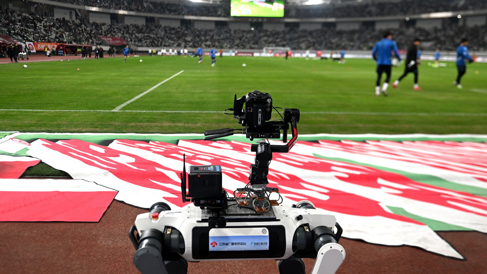 चीन के जिआंगसू प्रांत के सूज़ो स्थित ओलंपिक स्पोर्ट्स सेंटर स्टेडियम में सूज़ो और नानजिंग के बीच फुटबॉल मैच के दौरान रोमांचक पलों को कैद करने के लिए एक रोबोटिक कुत्ते, जिसे "कैमरामैन" कहा गया, को तैनात किया गया था।