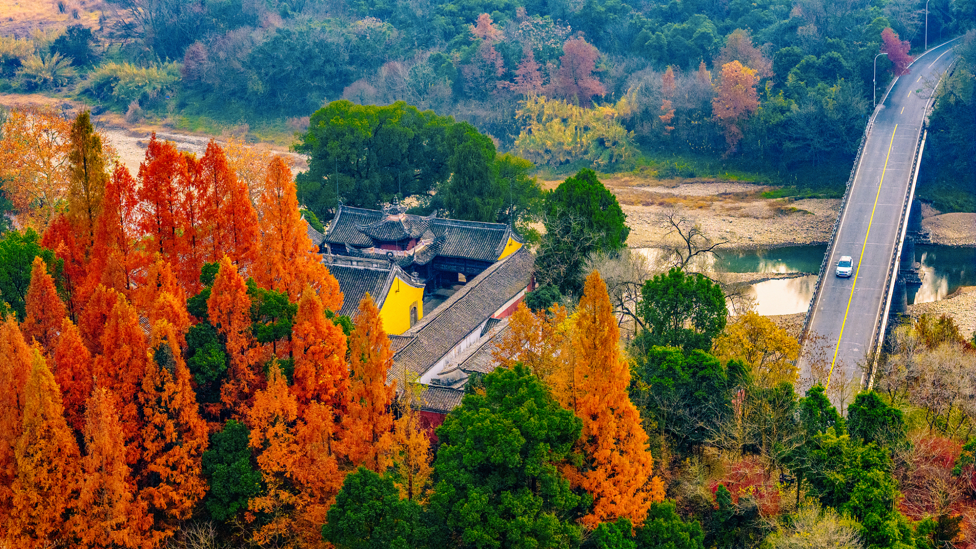 चच्यांग प्रांत के शाओशिंग स्थित वांगथान कस्बे में शरद ऋतु के रंग