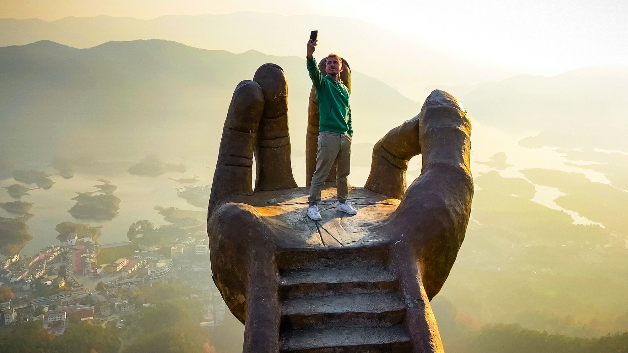 हुबेई: विदेशी पर्यटक बुद्ध के हाथ की मूर्ति पर खड़े हैं