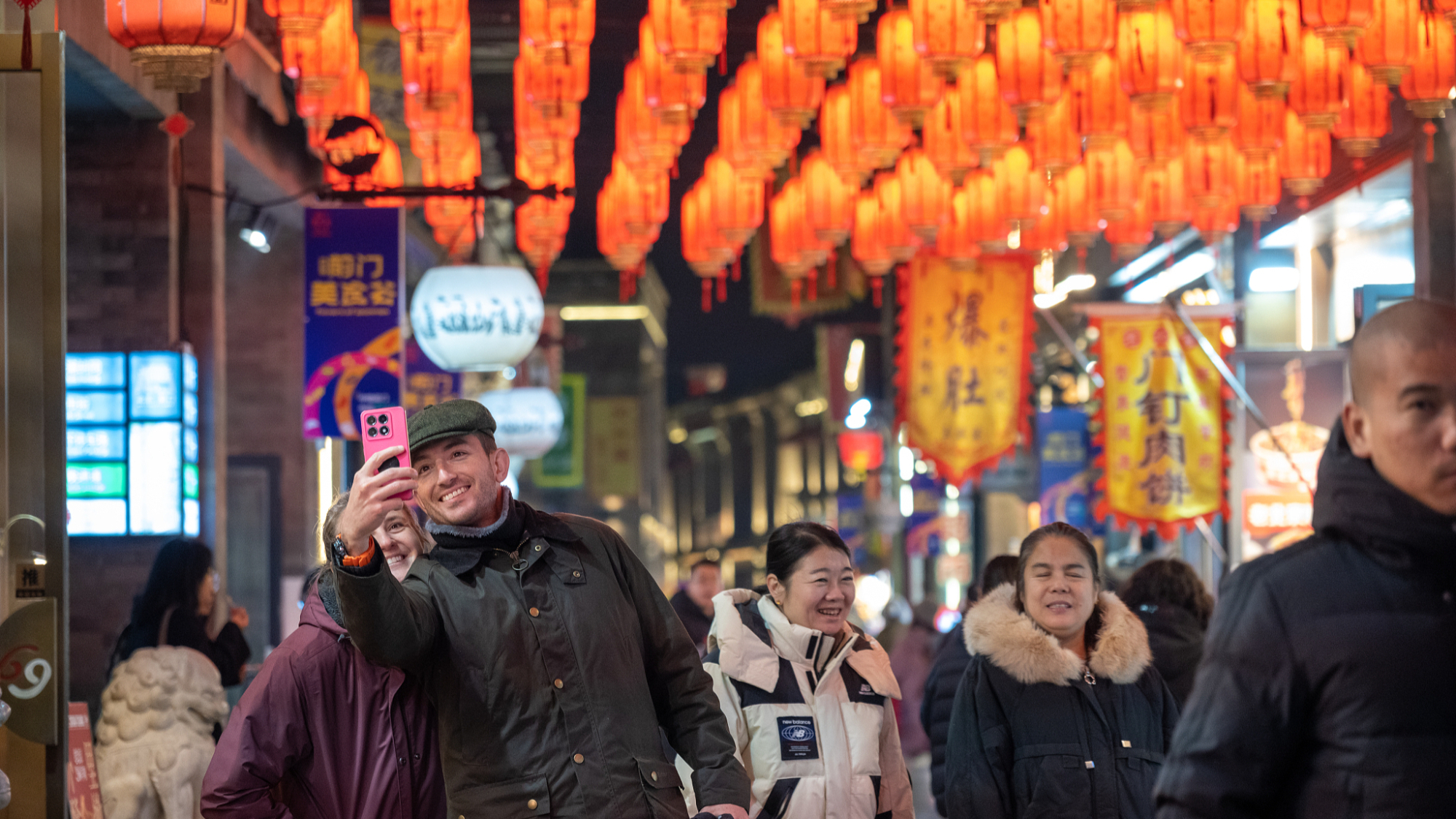 पेइचिंग में छयानमेन स्ट्रीट पर घूमने आए विदेशी पर्यटक