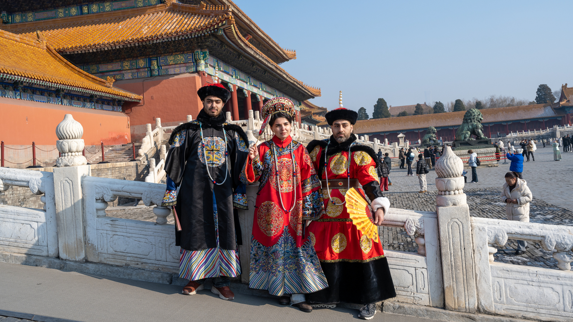 पारंपरिक चीनी कपड़े पहने विदेशी पर्यटक फॉरबिडन सिटी घूमते हुए।