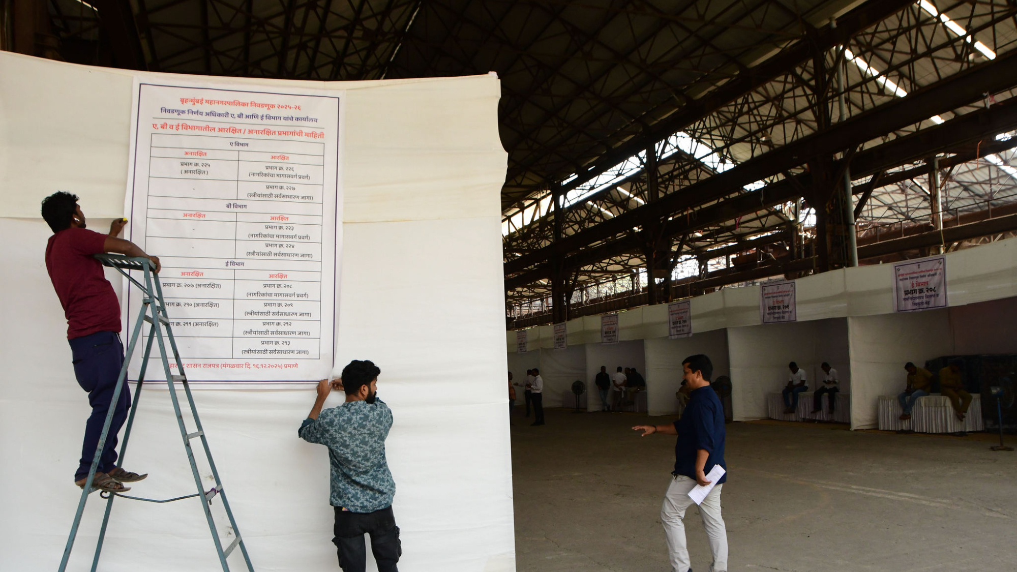 22 दिसंबर को, मुंबई में मज़दूरों ने बायकुला में रिचर्डसन एंड क्रूडस कंपनी के परिसर में नगर निगम (BMC) चुनावों के लिए पोलिंग टेंट लगाए। यह 15 जनवरी, 2026 को होने वाले नगर निगम चुनावों की तैयारी है।