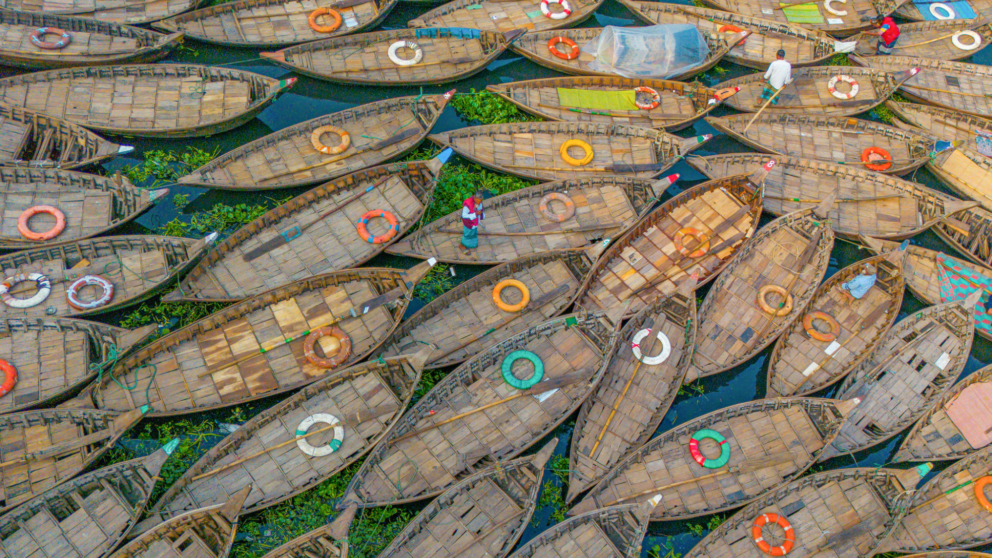बांग्लादेश के ढाका में सदरघाट नदी पर नावें एक साथ बंधी हुई हैं, जिससे फूलों जैसी आकृति बन गई है।