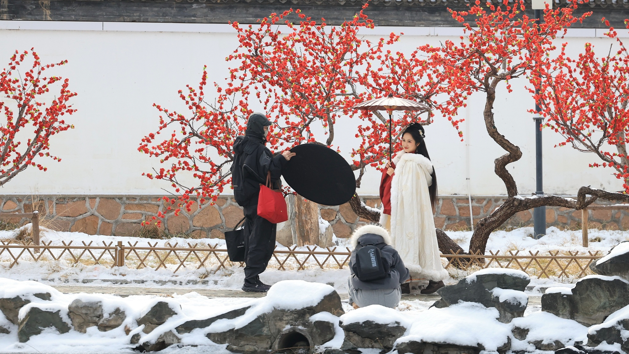 बर्फबारी के बाद पेइचिंग ग्रैंड व्यू गार्डन में नज़ारे का मज़ा लेते लोग