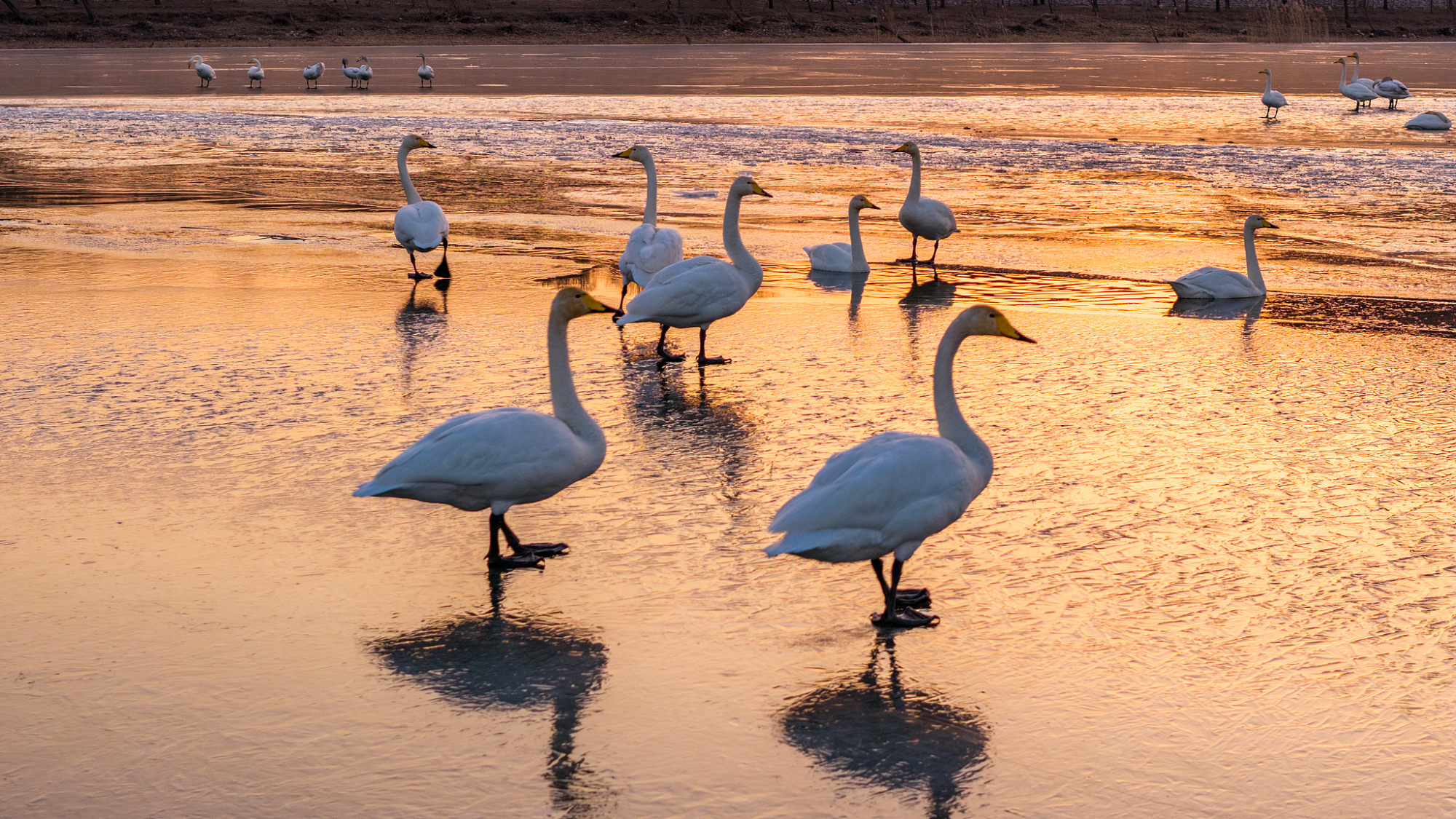 पेइचिंग के हुआइरोऊ रिज़रवॉयर की बर्फ़ पर खाना ढूंढते हंस।