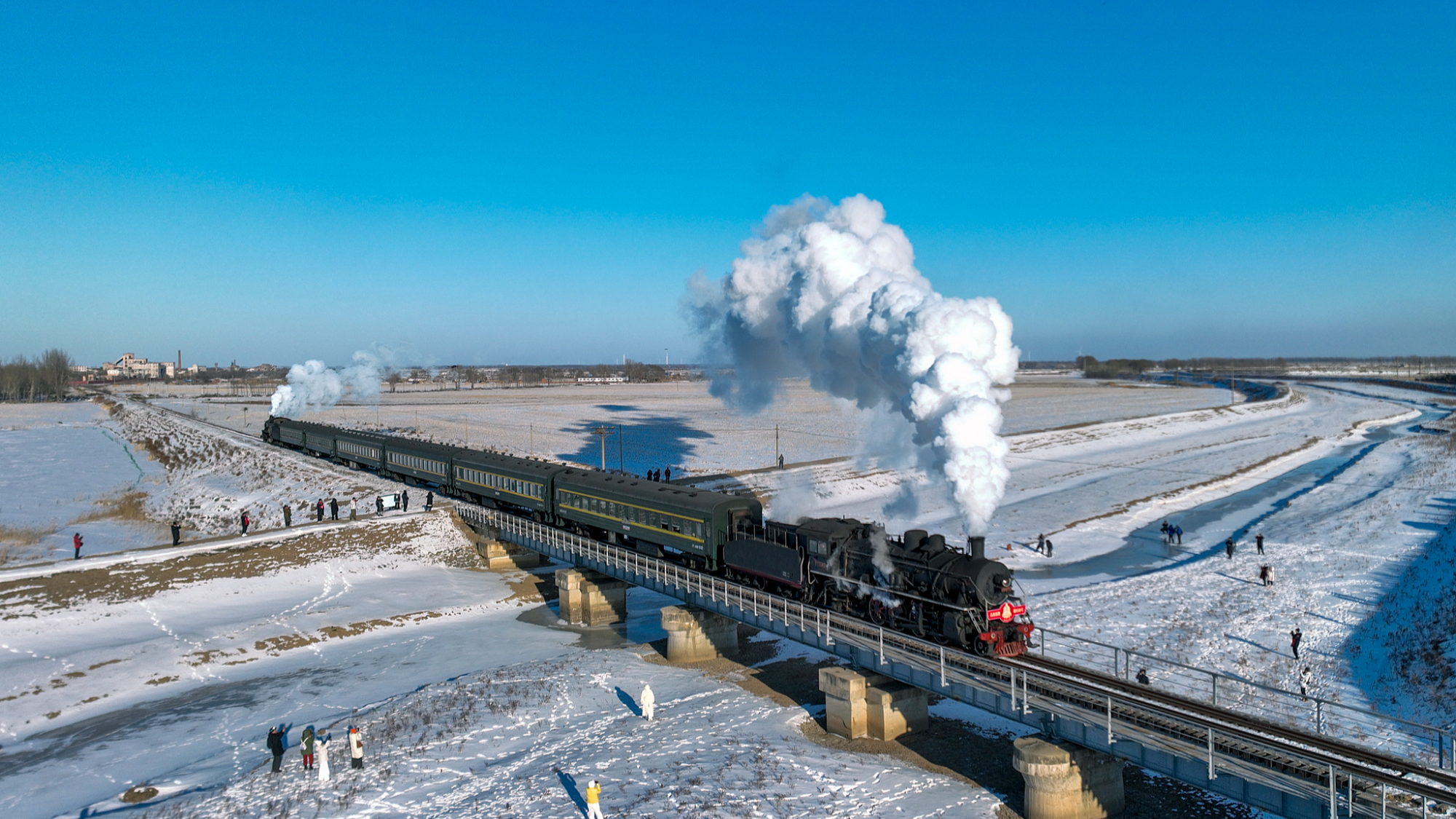 ल्याओ नींग प्रांत के डियाओबिंगशान क्षेत्र में बर्फ से ढके बड़े मैदान से गुज़रता एक स्टीम लोकोमोटिव