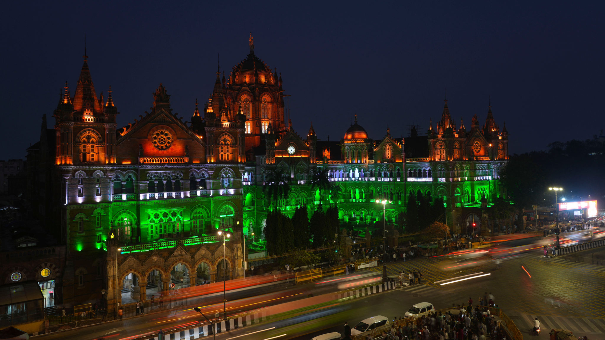भारत:गणतंत्र दिवस के मौके पर भारतीय ध्वज के रंगों से छत्रपति शिवाजी टर्मिनल बिल्डिंग को रोशन किया गया