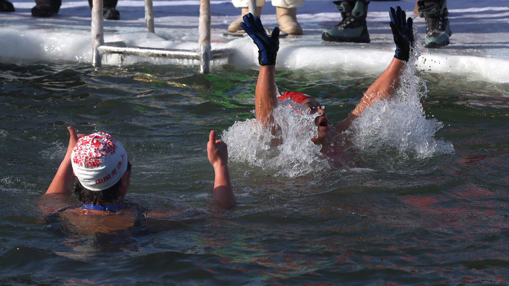 हेईलुंगच्यांग प्रांत के हारपीन शहर में शीतकालीन तैराकी के शौकीन लोग जमा देने वाली ठंड की चुनौती का आनंद लेते हैं