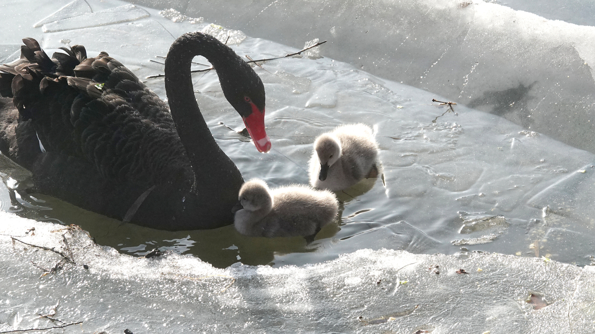 पेइचिंग के युआनमिंगयुआन पार्क में बर्फ पर खेलते काले हंस के बच्चे।