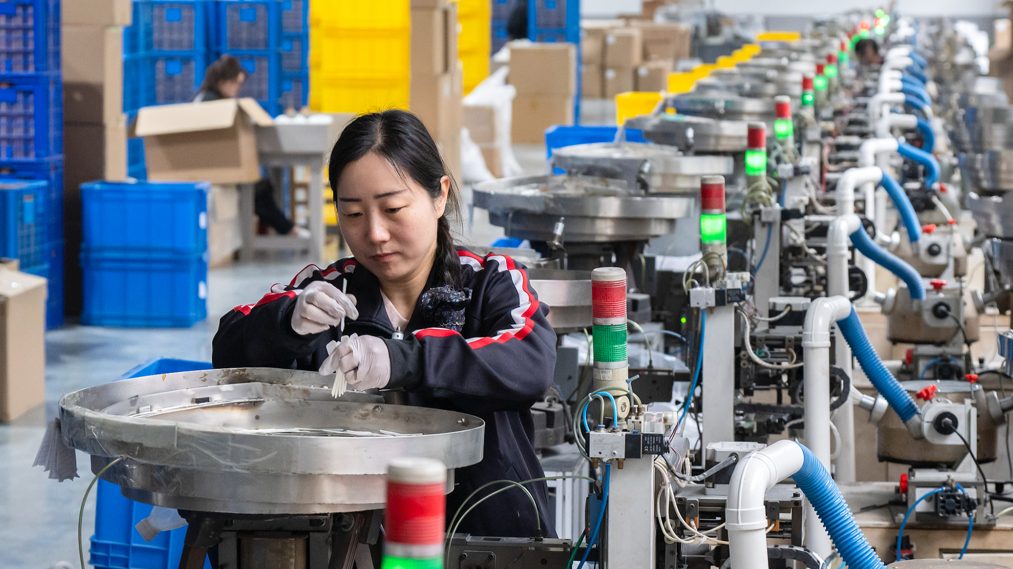 16 अप्रैल को, चीन के आनहुई प्रांत के वुवेई शहर में स्थित वुवेई छाओयू स्पोर्टिंग गुड्स कंपनी लिमिटेड में, कर्मचारी एक स्मार्ट उत्पादन लाइन पर बैडमिंटन उत्पादों का उत्पादन कर रहे हैं।