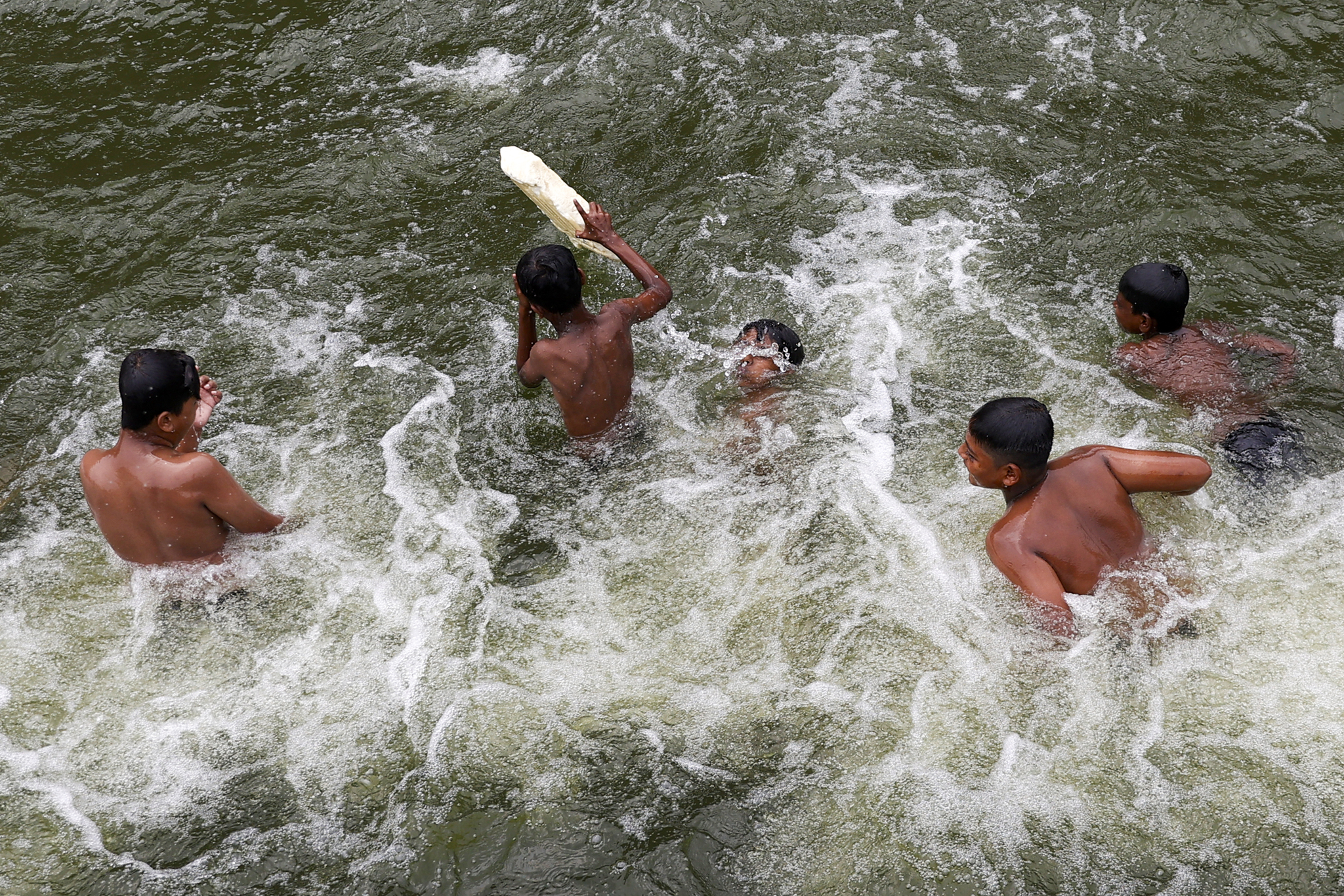बांग्लादेश के ढाका में गर्मी के दौरान बच्चे पानी में खेलकर ठंडक पा रहे हैं।