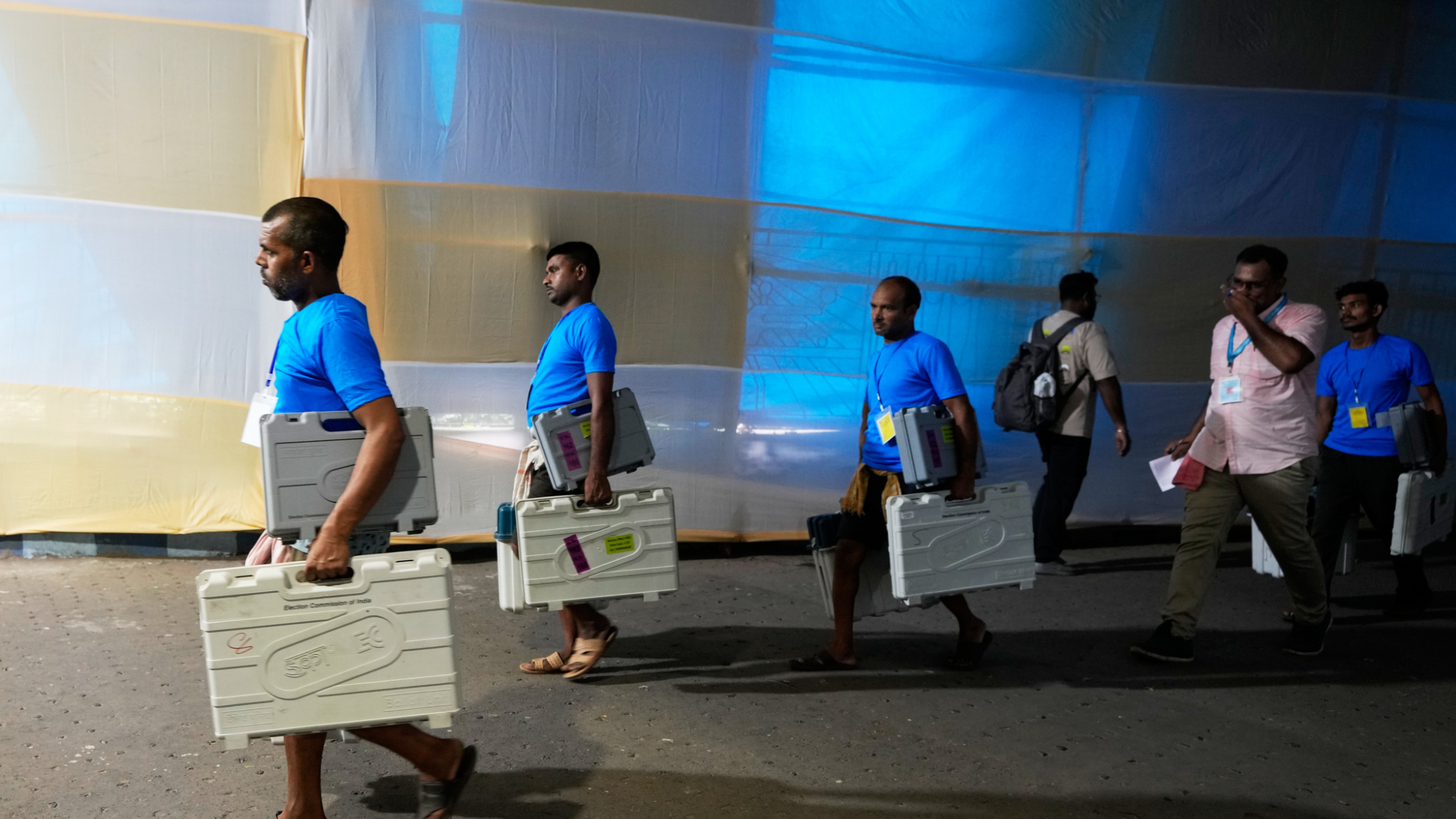 28 अप्रैल को कोलकाता में पश्चिम बंगाल विधानसभा चुनाव के अंतिम चरण के मतदान से पहले सरकारी वितरण केंद्र से इलेक्ट्रॉनिक वोटिंग मशीन ले जाते हुए मतदानकर्मी। असम, केरल, तमिलनाडु, पश्चिम बंगाल और पुडुचेरी कॉमनवेल्थ क्षेत्र में मार्च से मई 2026 के बीच विधानसभा चुनाव हो रहे हैं।